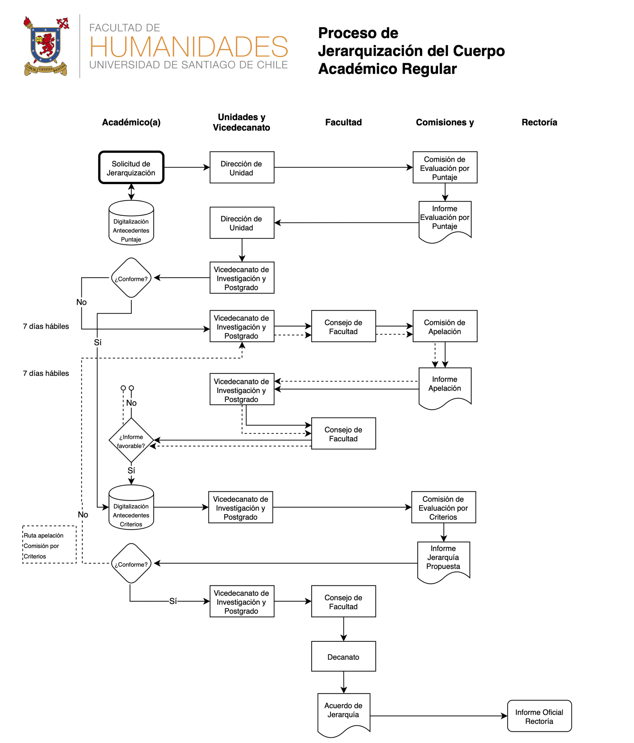 El proceso de Jerarquización de la Facultad de Humanidades se ordena y realiza según lo indicado en el Decreto Nº 26 de 1986. Su realización consta de las siguientes fases: