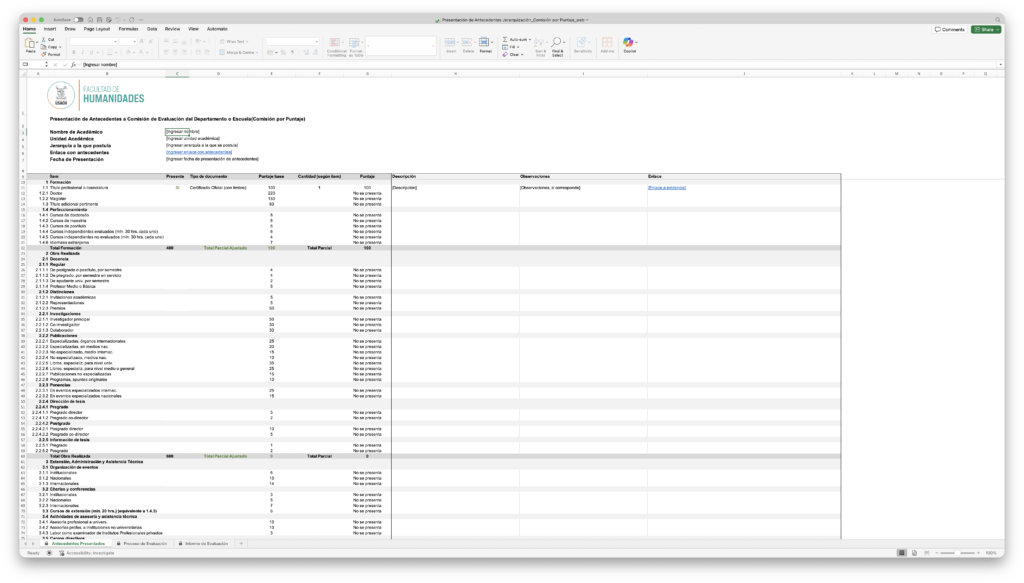Segundo: Una vez se satisfagan los criterios para la jerarquía a la que se postula, el proceso inicia con la evaluación de antecedentes académicos por parte de la Comisión de Evaluación del Departamento o Escuela (Comisión por Puntaje). Puede encontrar una propuesta de estructura de organización de antecedentes, para ser descargada, en el listado contiguo. Asimismo, puede organizar la presentación de antecedentes descargando la matriz también listada: