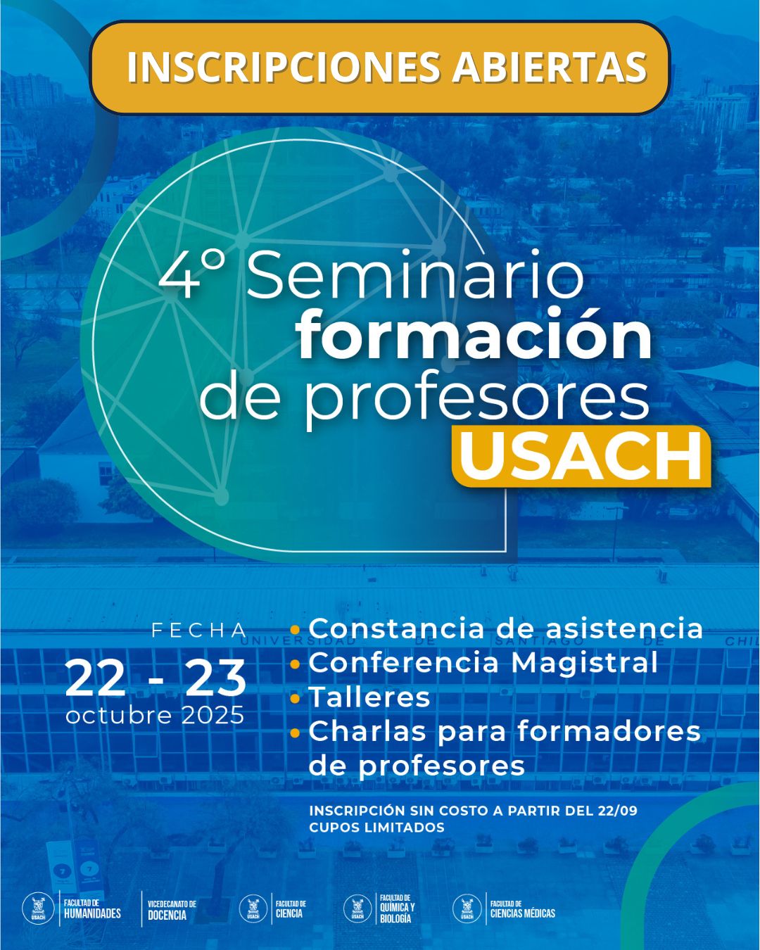 La Facultad de Humanidades de la Universidad de Santiago de Chile tiene el agrado de invitarles a participar en el IV Seminario de Formación de Profesores Usach, instancia orientada a fortalecer la labor docente, compartir experiencias innovadoras y fomentar redes de colaboración entre formadores de profesores.